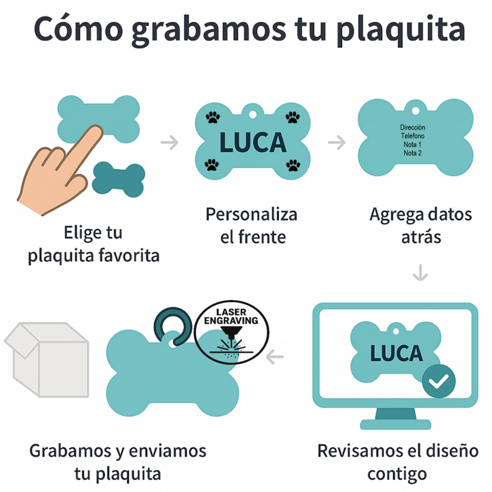 Usamos grabado láser de alta precisión y empaquetamos tu plaquita lista para acompañar a tu mascota.