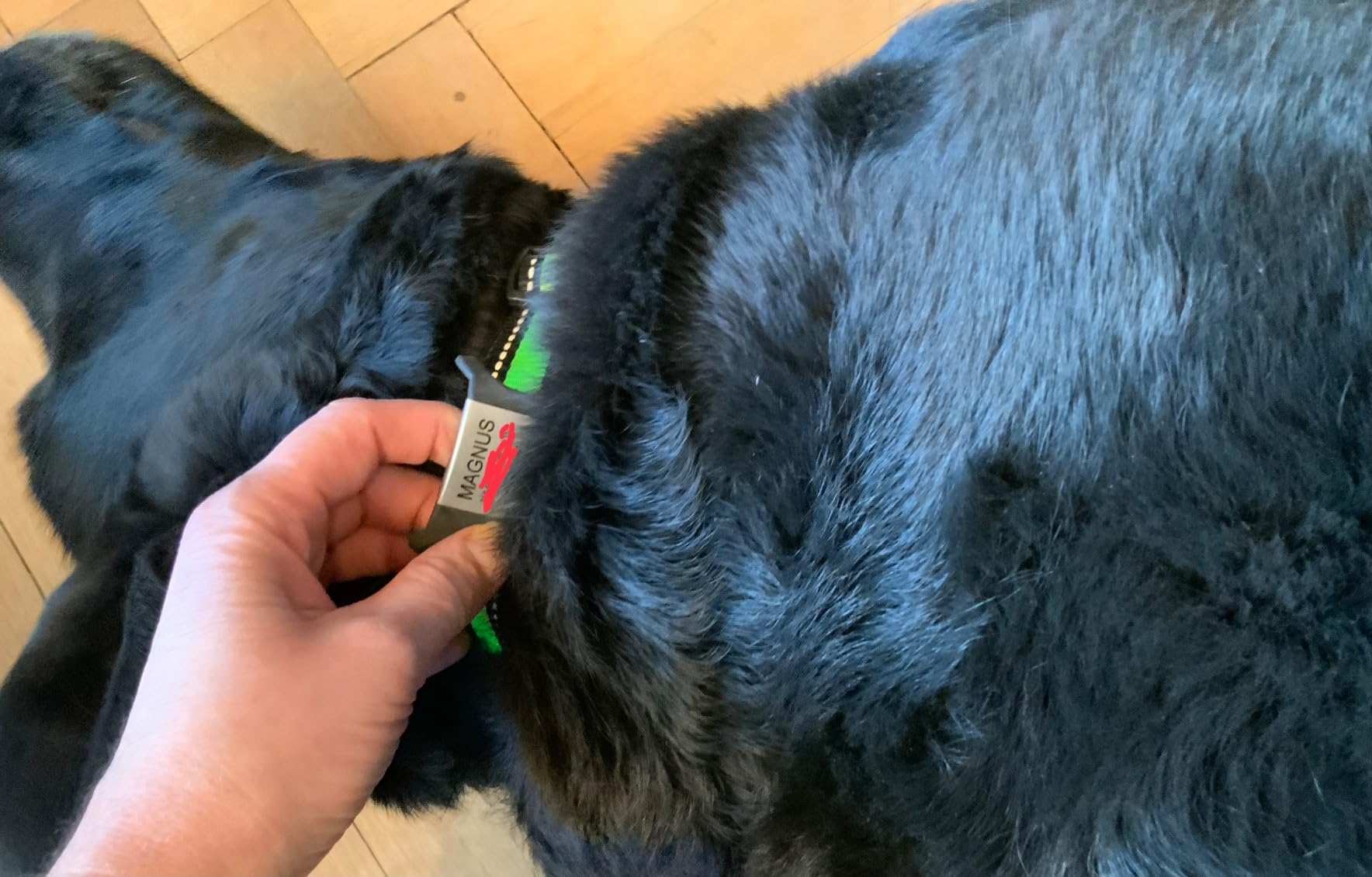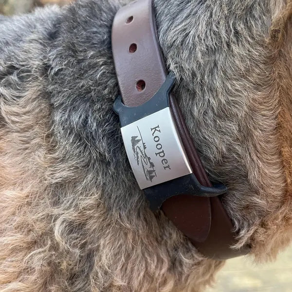 Placa rectangular de acero inoxidable con base de silicona flexible, la solución más práctica y silenciosa para identificar a tu mascota. Fácil de instalar en cualquier collar.